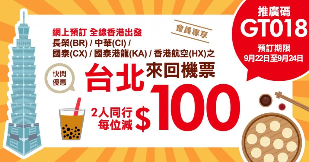 香港出發到台北來回機票二人同行每人減$100推廣碼:GT018