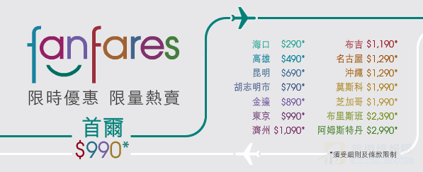 港龍航空: http://www.dragonair.com/ka/zh_HK/latest-offers/flights/fanfares/index.html