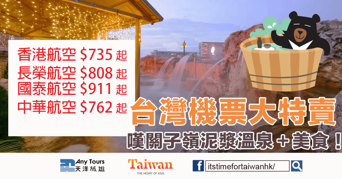 秋風起,嘆關子嶺泥漿溫泉+美食!台灣機票大特賣!華航飛台灣$762起,長榮飛台北$808起,國泰飛台灣$911起,港航飛台北$735起 – Any Tours天洋旅遊