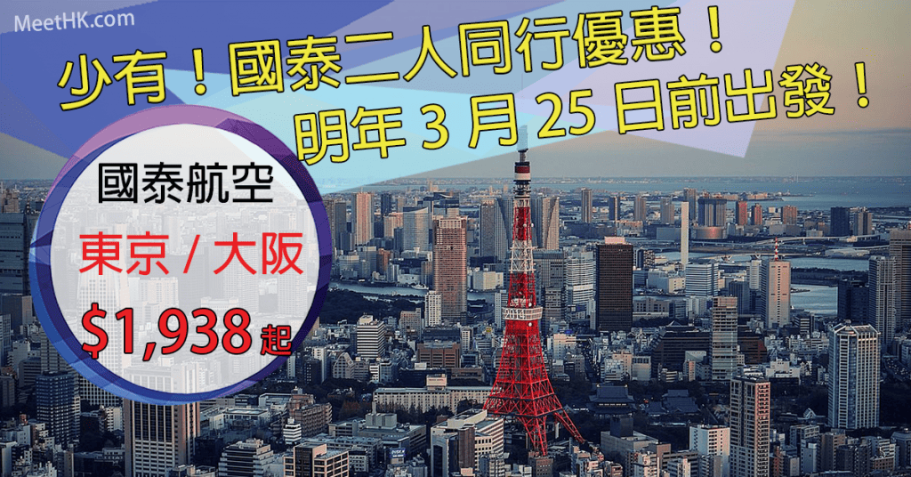 國泰日本線減啦!平飛東京大阪!明年3月25日前出發!香港往返東京、大阪二人同行每人只需$1,938起 – 國泰航空 (優惠至10月27日)