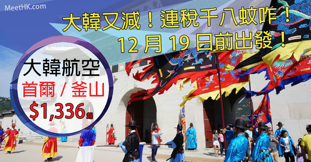 正呀!大韓又減!連稅千八蚊飛韓國!12月19日前出發!香港往返首爾、釜山只需$1,336起 – 大韓航空 (優惠至10月21日)
