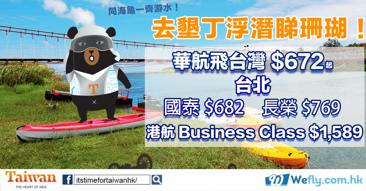 去墾丁浮潛睇珊瑚同海龜一齊游水!華航飛台灣$672起(可open jaw),國泰飛台北$682,長榮飛台北$769,港航Business Class飛台北$1,589 – Wefly.com.hk (優惠至10月11日)