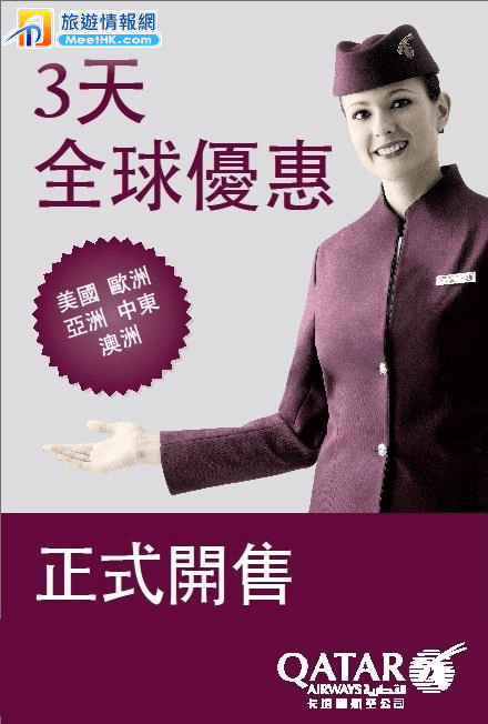 全球最佳航空公司卡塔爾航空今日推出左3天全球優惠,優惠涵蓋全球100多個目的地,今次開賣明年5月底前出發既機票