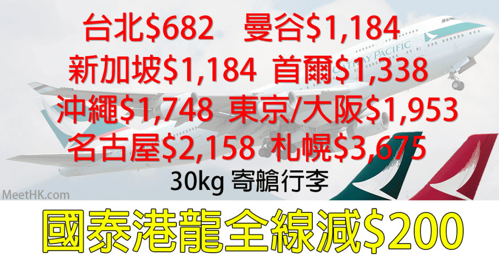 國泰/港龍全線減$200!30kg行李!台北$682,曼谷/新加坡$1,184,首爾$1,338,沖繩$1,748,東京/大阪$1,953,名古屋$2,158,札幌$3,675,洛杉磯$2,906,三藩市$3,490 – GoGoGo! (優惠至10月10日)