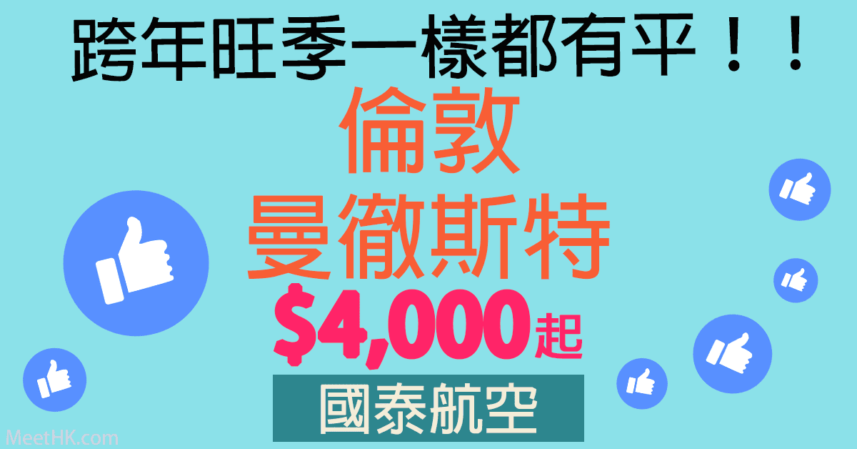 嘩嘩嘩!國泰直飛英國再減!聖誕跨年一樣有平!明年5月31日前出發!香港直航往返倫敦、曼徹斯特二人同行每人只需$4,000起 – 國泰航空 (優惠至10月31日)
