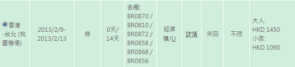 價錢大致上同華航差唔多,明年農曆新年2月9日至2月13日(年廿九至年初四)期間出發,香港往返台北只需$1,450,連埋稅只係$2,176