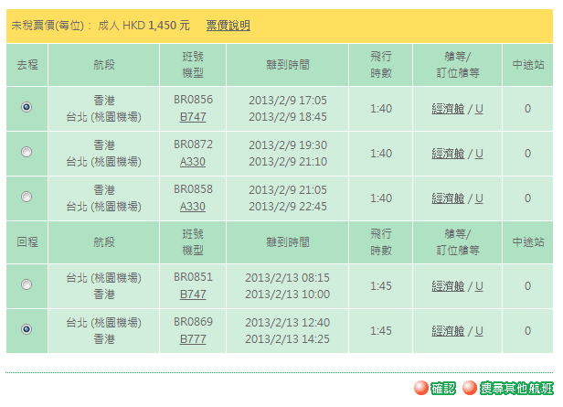 不過我地check過部份日子剩返唔係太多航班可以揀,年初四返得返BR851 08:15-10:00同BR869 12:40-14:25