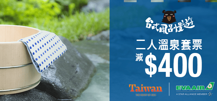 而家係ZUJI預訂長榮航空台灣溫泉套票(機票+酒店),二人同行連稅滿$3,000輸入優惠碼即享減$400優惠,好抵玩!