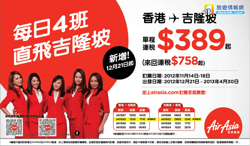 亞航將會係12月21日起,增加香港來往吉隆坡既航班,由原本每日3班增加至4班