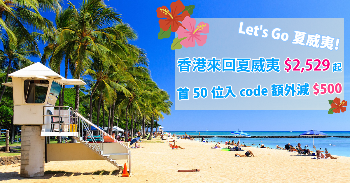 喺hutchgo.com預訂聯合航空香港飛夏威夷來回機票,輸入埋電子禮券碼”LoveHawaii500″即減$500!名額50個!