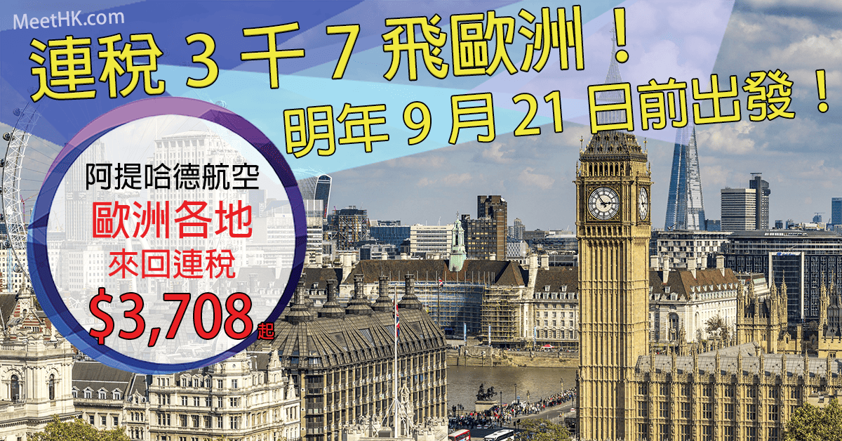 連稅3千7飛歐洲!明年9月21日前出發!香港往返歐洲各地連稅只需$3,708起 – 阿提哈德航空 (優惠至11月13日)