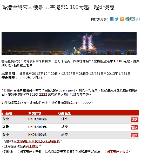 1月底前出發 香港往返台北、高雄、台中只需 $1,100,連埋稅$1,794,呢個價算唔錯