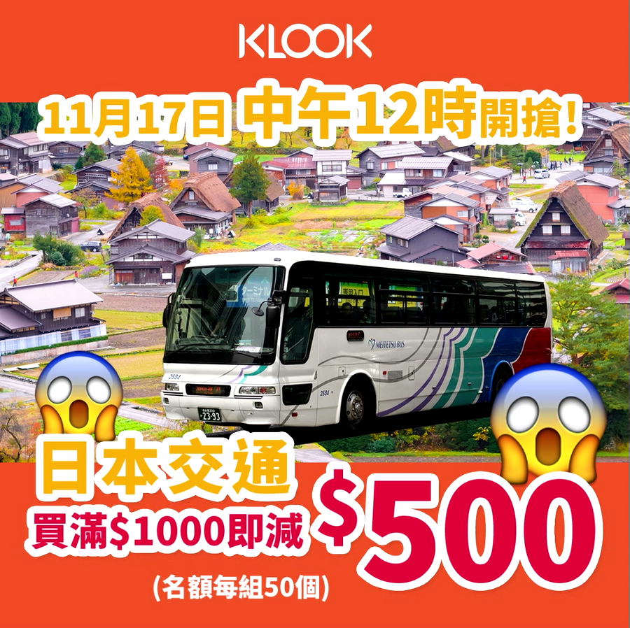 日本交通/韓國交通/全線歐洲活動滿$1,000即減$500 (各組優惠碼將於11月17日中午12點喺活動頁面公佈,名額各50個,共150名)