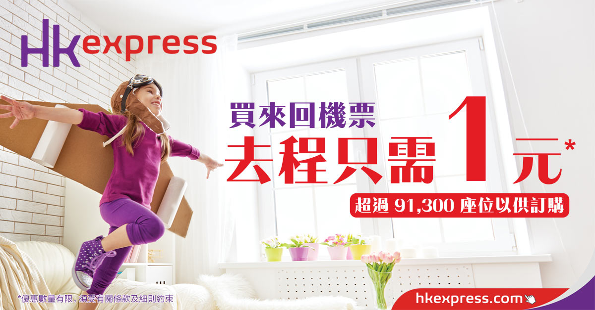 買回程,去程$1!下午6時開賣!香港飛台灣/東南亞來回$179起,日本各地$349起,首爾/釜山/濟州$349起 – HK Express (優惠至11月21日)