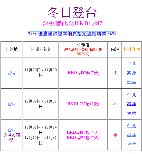 最後一隻都係二人同行優惠,適合12月15日至1月31日期間出發,香港往返台北、高雄、台中只需$870,連埋稅$1,597