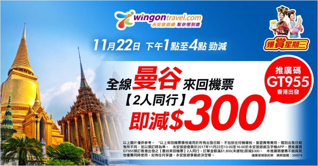 泰抵啦!全線曼谷機票二人同行即減$300!港航飛曼谷$800起、泰航$1,020起、國泰$1,380起 – 永安旅遊 (優惠至11月22日4pm)
