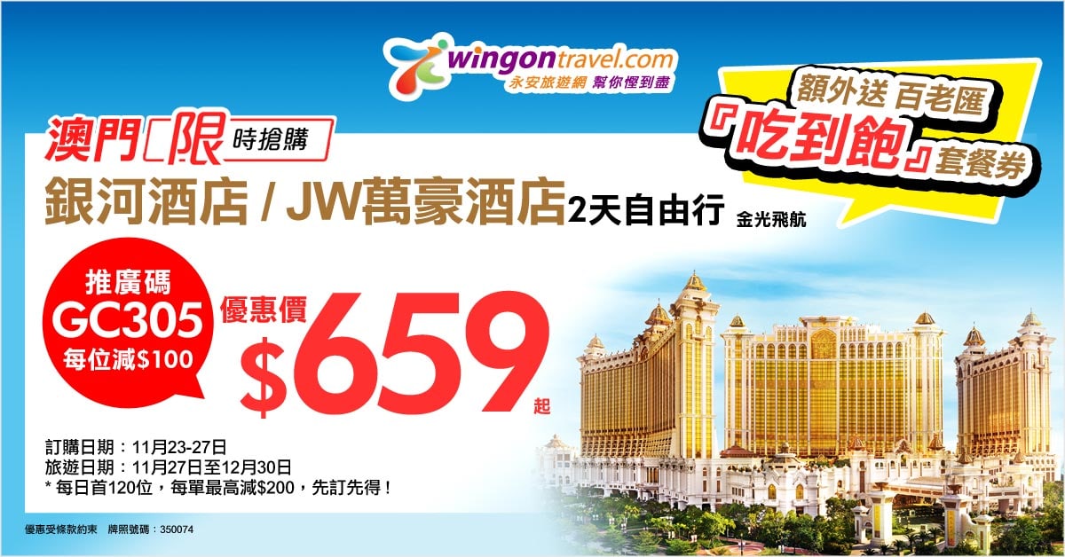 金光飛航澳門「銀河及JW Marriott酒店」自由行套票每位減$100優惠碼:GC305 (名額每天首120位,先訂先得!)