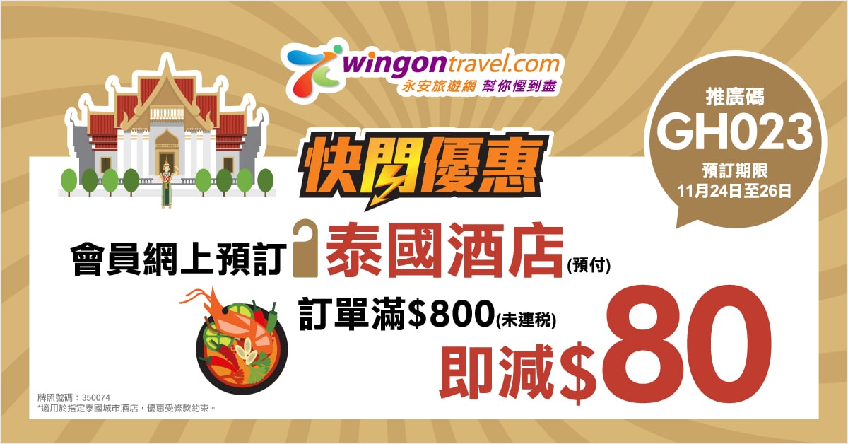 永安旅遊推出左限時3日泰國酒店優惠,預訂泰國酒店每單滿$800(未連稅)即減$80