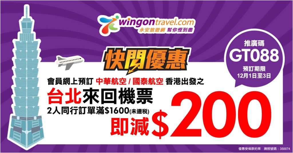永安旅遊會係今晚12點(12月1日0:00)推出國泰/華航飛台北機票2人同行滿$1,600(未連稅)即減$200優惠