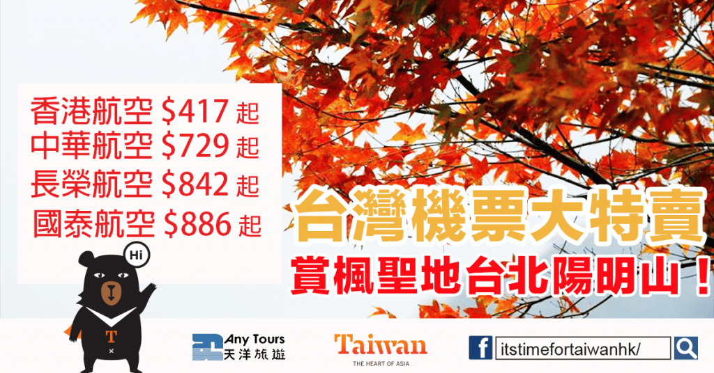 出發台北賞楓 + 台灣機票大特賣!港航飛台北$417起,華航飛台灣$729起,長榮飛台北$842起,國泰飛台灣$886起 – Any Tours天洋旅遊