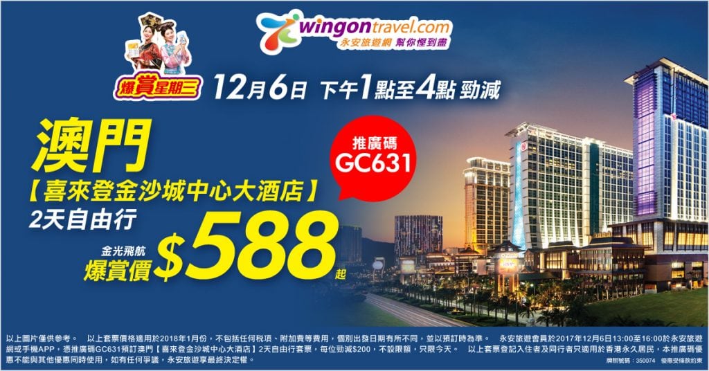 永安旅遊會係明天(12月6日)下午1點推出限時3小時澳門喜來登金沙城中心大酒店套票每位減$200優惠,不限名額