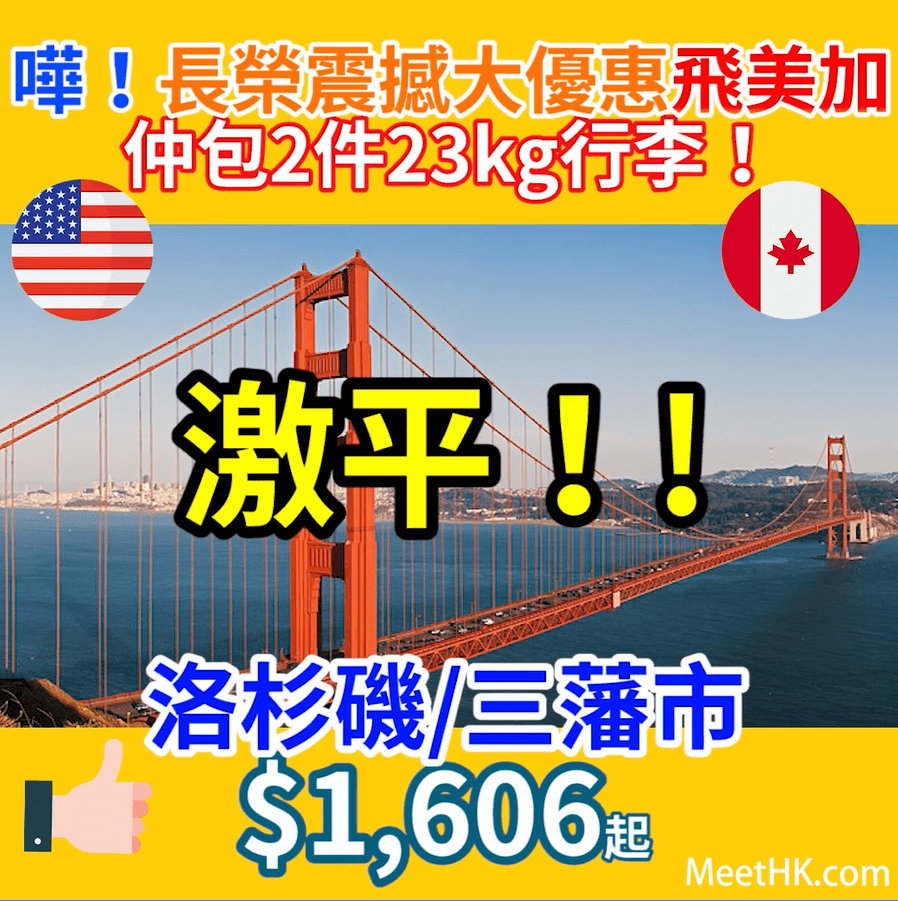 勁勁勁平!長榮連稅2千幾飛美加!明年5月31日前出發!香港往返洛杉磯/三藩市只需$1,606起、溫哥華$2,124起 – 長榮航空 (優惠至12月22日)