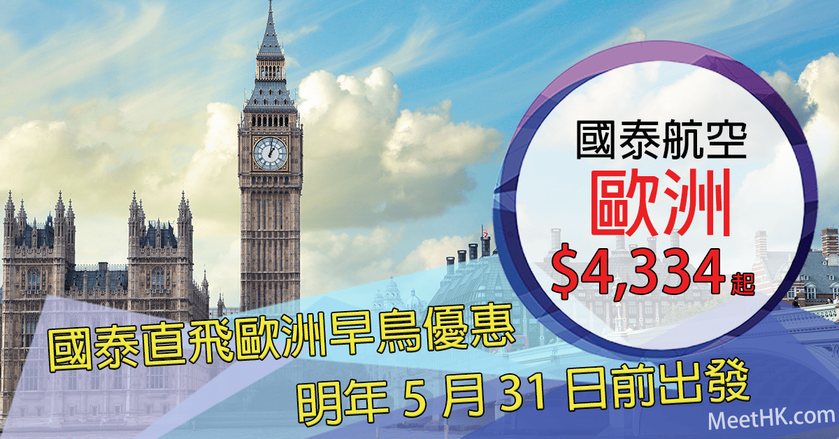 國泰直飛歐洲早鳥優惠!明年5月31日前出發!香港直航往返歐洲各地只需$4,334起 – 國泰航空 (優惠至12月31日)