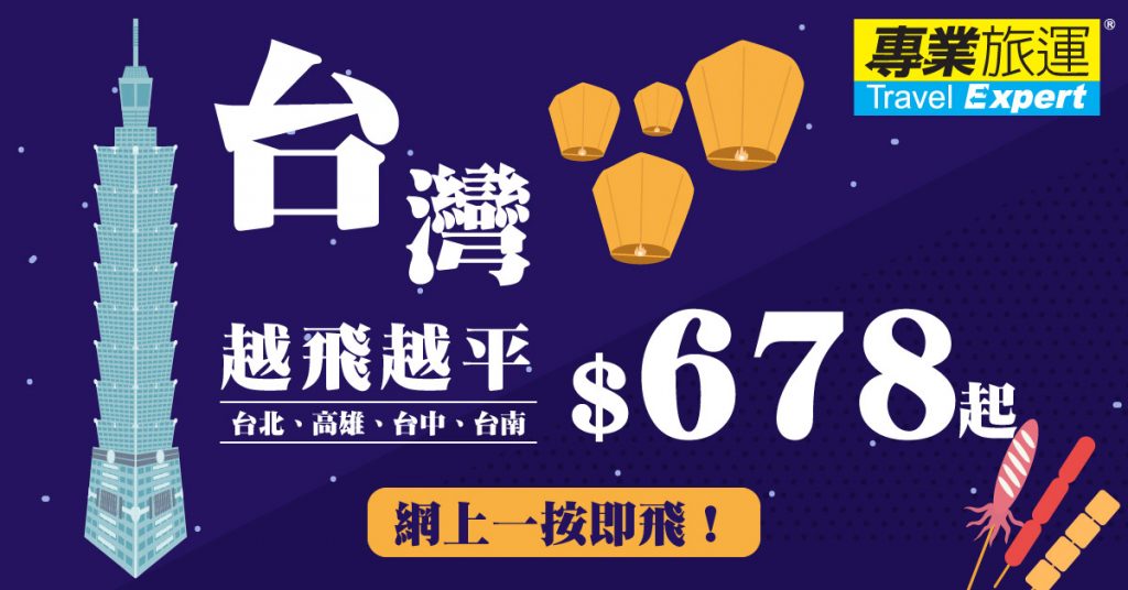 台灣越飛越平!30kg行李!國泰飛台灣$820起,華航飛台灣$678起,長榮飛台北$761起 – 專業旅運 online.texpert.com (優惠至12月23日)