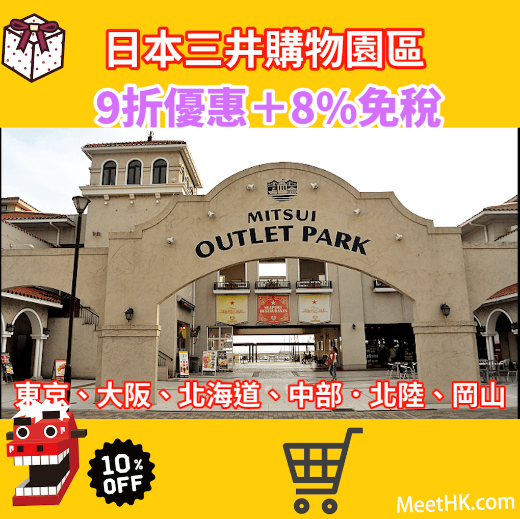 優惠券適用於日本最大規模購物園區Mitsui Fudosan,可享高達9折優惠+8%免稅+送日本製三色可擦