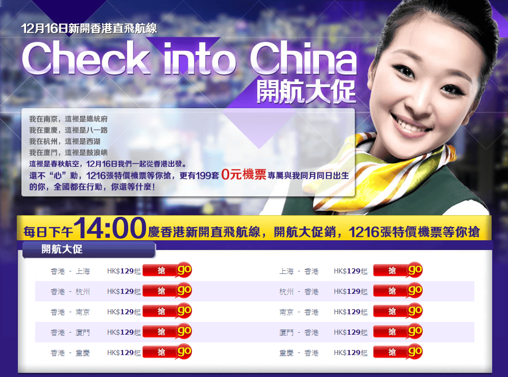 慶祝開航!每天2pm開搶!香港往返杭州、南京、重慶、上海、廈門單程只需$129 – 春秋航空