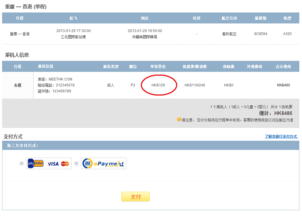 我們以1月29日重慶回香港單程為例,機票只需$129 + 稅$356,機票連稅$485