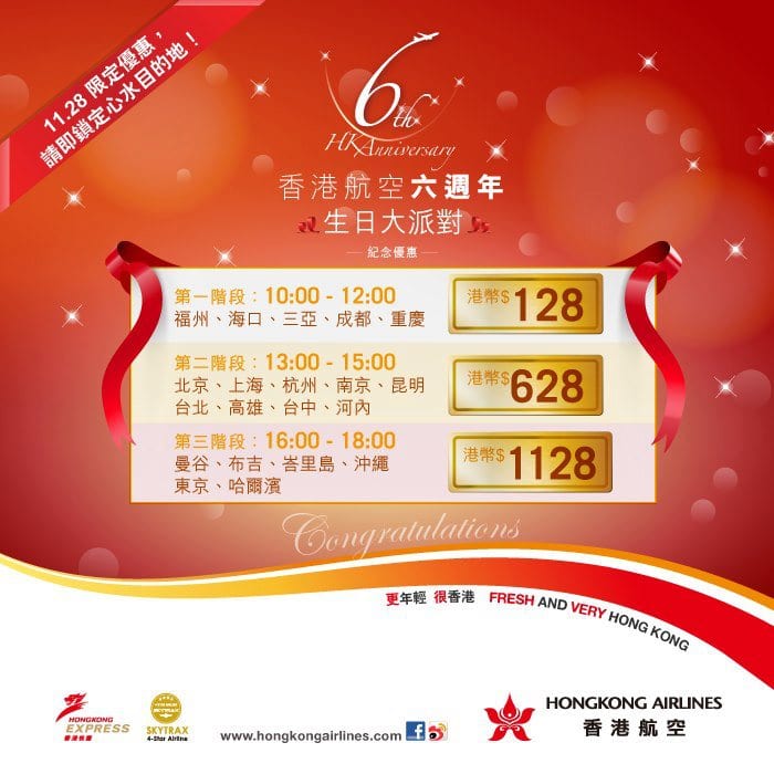 早上10時開搶!慶祝6歲生日!香港往返國內城市只需$128起,台灣、河內$628,曼谷、布吉、峇里島、沖繩、東京$1,128 – 香港航空 (優惠至11月28日6pm)