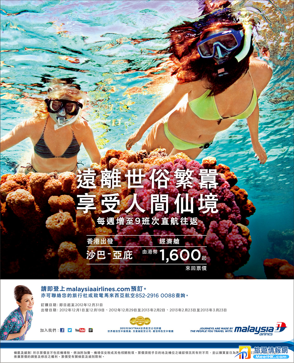 馬航亦再度延長沙巴既機票優惠,香港往返沙巴只需$1,600,連埋稅$2,427