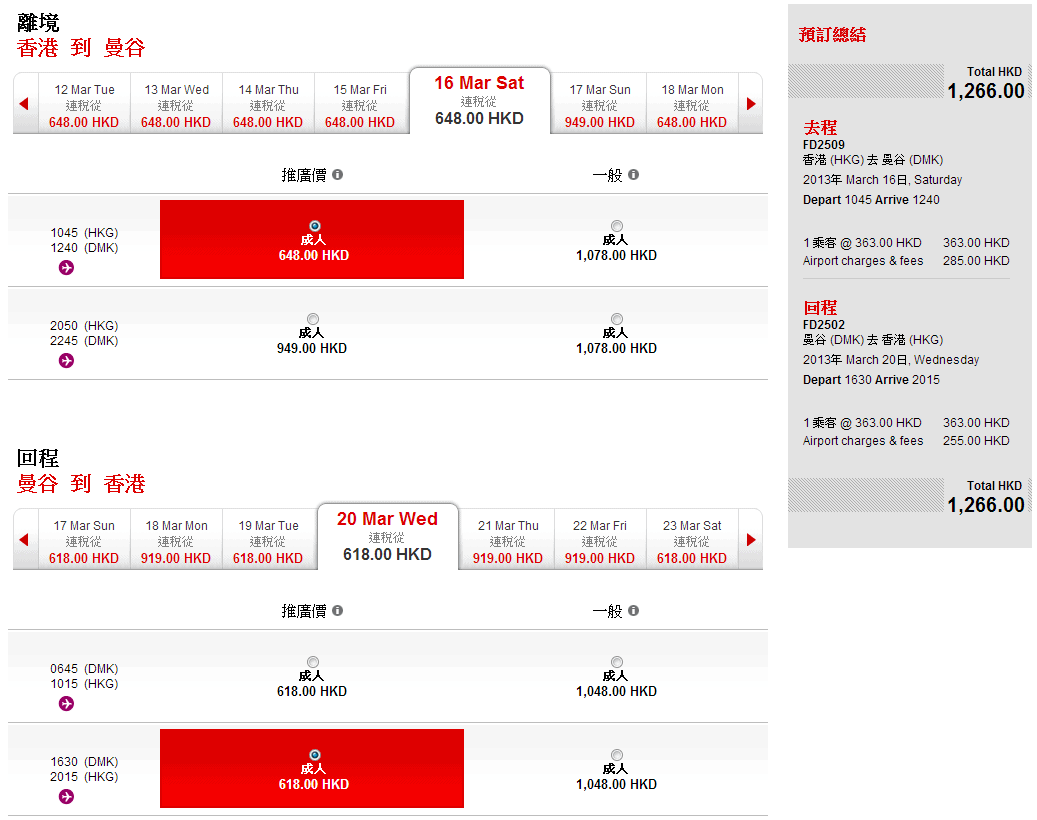 經我們測試,以曼谷3月16日出發,3月20日返回為例