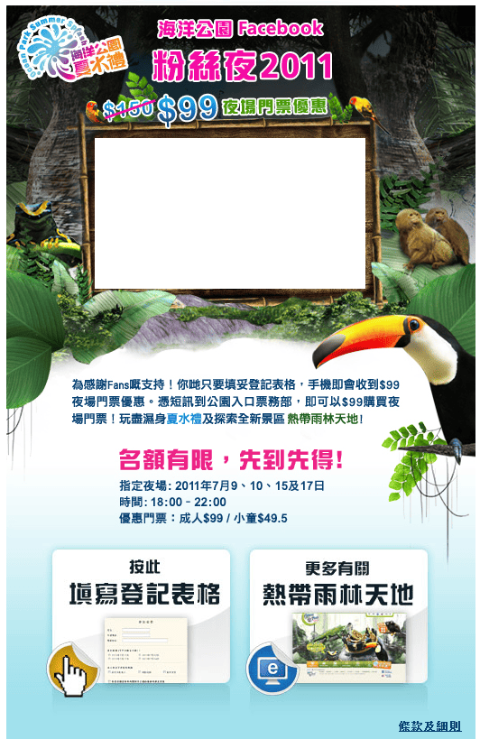 海洋公園Facebook 粉絲夜2011正式開始接受登記! 大家只要去海洋公園Facebook fan page填寫登記表格。就可以$99購買指定日子夜場門票