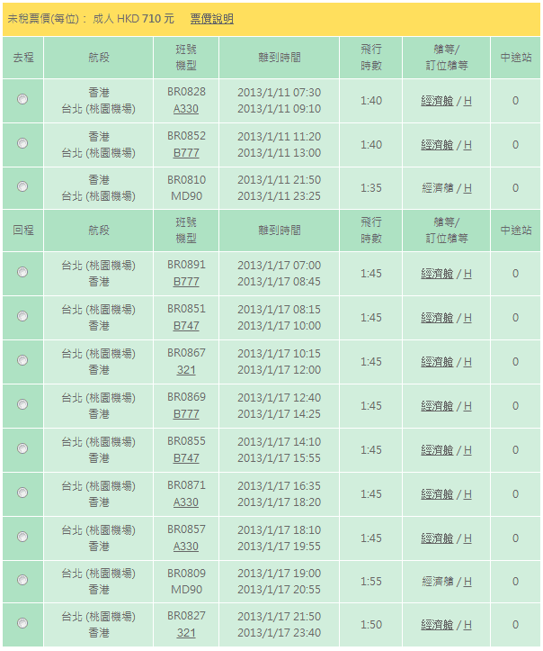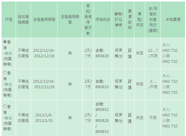 1月6日至31日期間出發去程限坐BR828 07:30-09:10、BR852 11:20-13:00、BR810 21:50-23:25