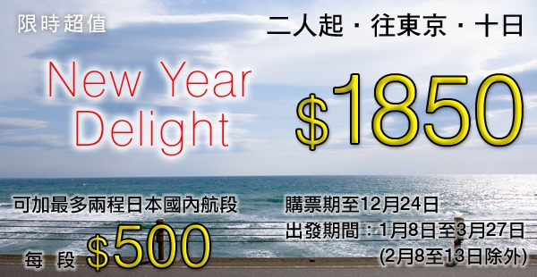 日航再出招!3月底前出發!機票有效期10日!香港往返東京二人同行每人只需$1,850 – 日本航空 JAL (優惠至12月24日)