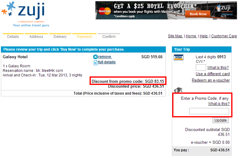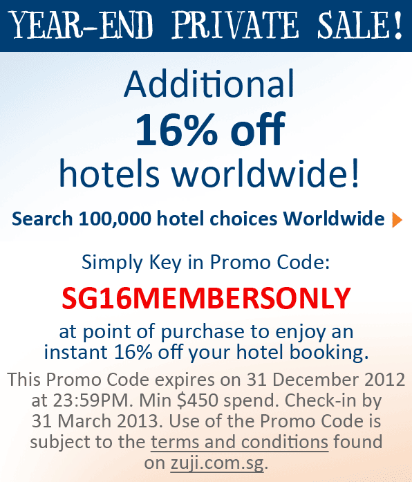 大家憑以下代碼在新加坡ZUJI預訂酒店,可享受額外16%的優惠 (2012年12月31日前預訂有效, 於2013年3月31日前入住)