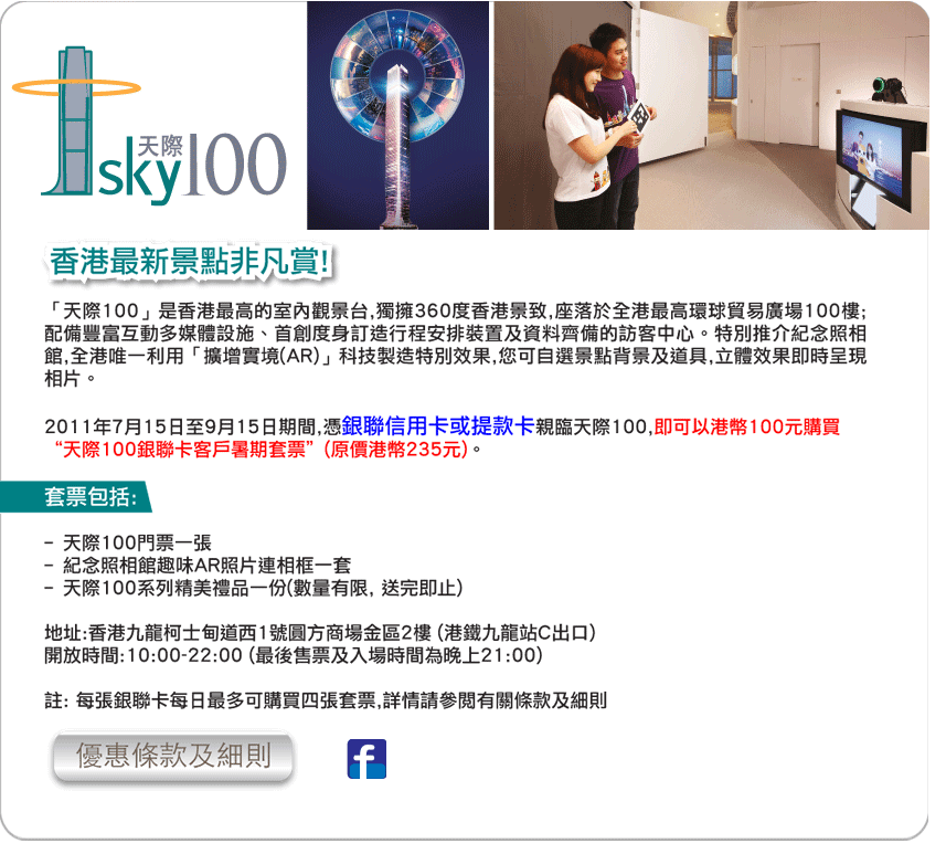 2011年7月15日至9月15日期間,憑銀聯卡親臨天際100,即可以港幣100元購買”天際100”銀聯卡客戶暑期套票” (原價港幣235元)。