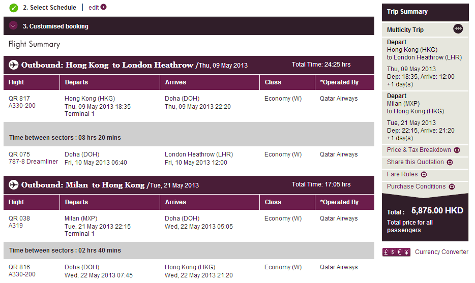 呢個優惠都可以 open jaw,即係去同返唔一定要係同一個地方,例如倫敦入羅馬出,係卡塔爾航空網站揀 Multi-city 就可訂到