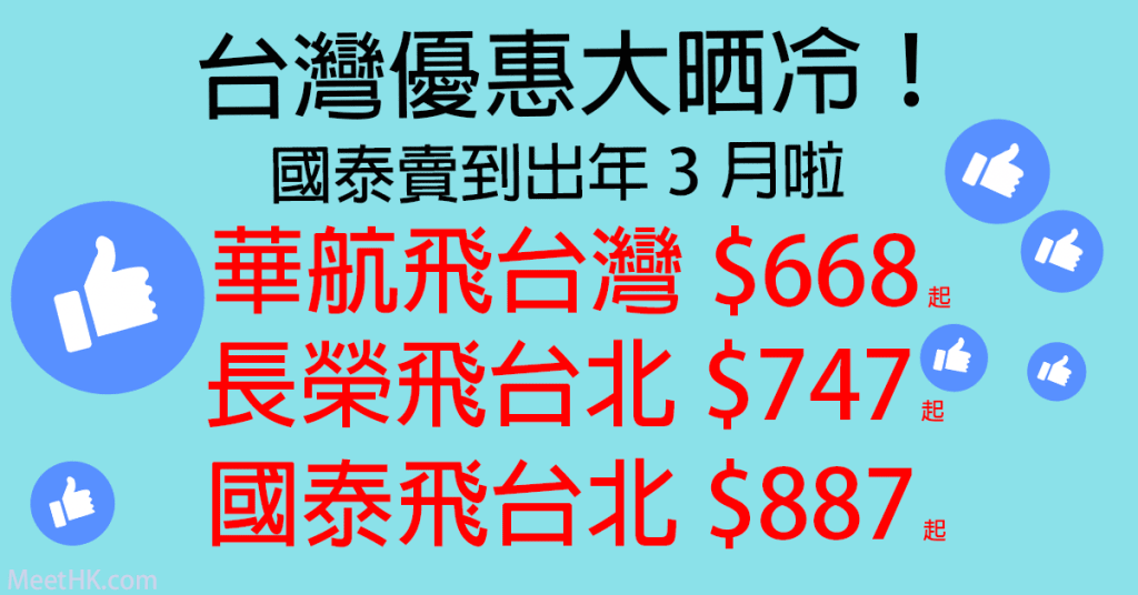 台灣優惠大晒冷!國泰賣到出年3月啦!華航飛台灣$668起,長榮飛台北$747起,國泰飛台北$887起,港航飛台北$622起 – Wefly.com.hk (優惠至7月26日)
