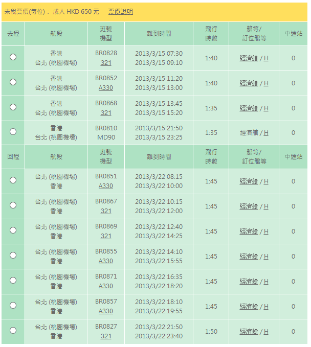 呢個優惠去程一共有四班機可以揀,包括BR828 07:30-09:10、BR852 11:20-13:00、BR868 13:45-15:20、BR810 21:50-23:25,唔似華航$650台北優惠只可以揀早機出發