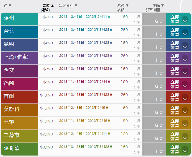 上一期曼谷、台中同沖繩一日內售罄,另外上一期開始,就算係同一地方既指定日子及航班優惠,有效期都可以有所不同