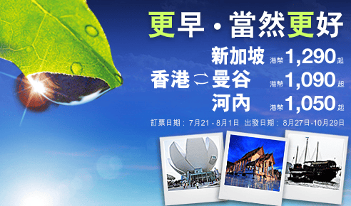 香港航空推出了[更早 當然更好]的機票優惠,提早預訂香港往返新加坡機票優惠價1,240起,曼谷1,090起,河內1,050起。