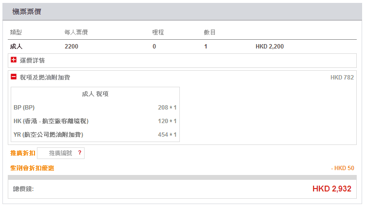 機票只需$2,200+ $782(稅),紫荊會會員減$50= 機票連稅$2,932