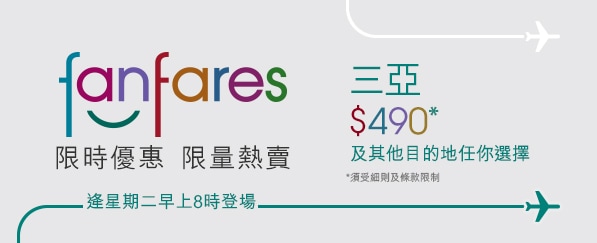 早上8時開搶!國泰 x 港龍 第十六期 fanfares 優惠 涵蓋11個城市只需$490起 – 國泰航空 / 港龍航空