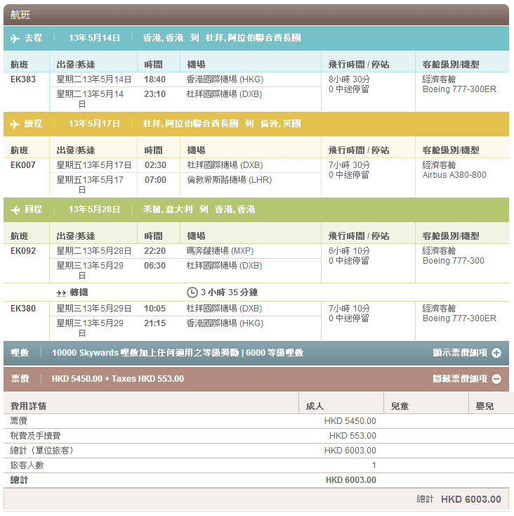 我地以5月14日香港飛杜拜,5月17日杜拜飛倫敦,5月28日米蘭返香港為例