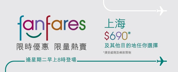 早上8時開搶!國泰 x 港龍 第十七期 fanfares 優惠 涵蓋11個城市只需$690起 – 國泰航空 / 港龍航空