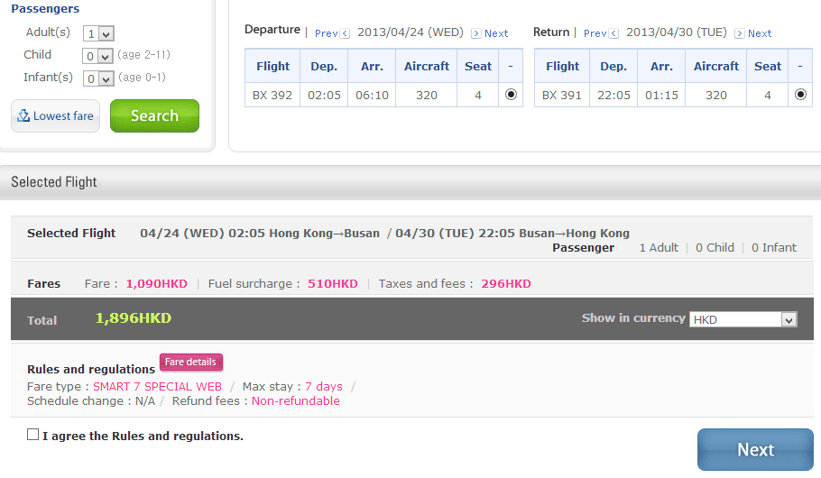 香港往返釜山只需$1,090,連埋稅都只係$1,896,價錢相當吸引呀