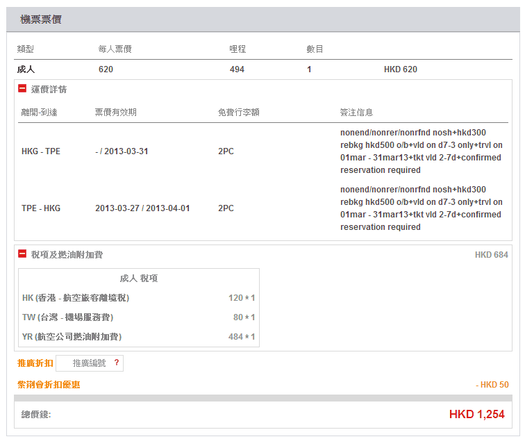 機票只需$620 + $684(稅) = 機票連稅$1,304,紫荊會會員再減$50,即係只需$1,254